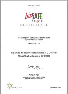 SENE has been certified to adhere by BizSAFE Star standards for Workplace Safety and Health.